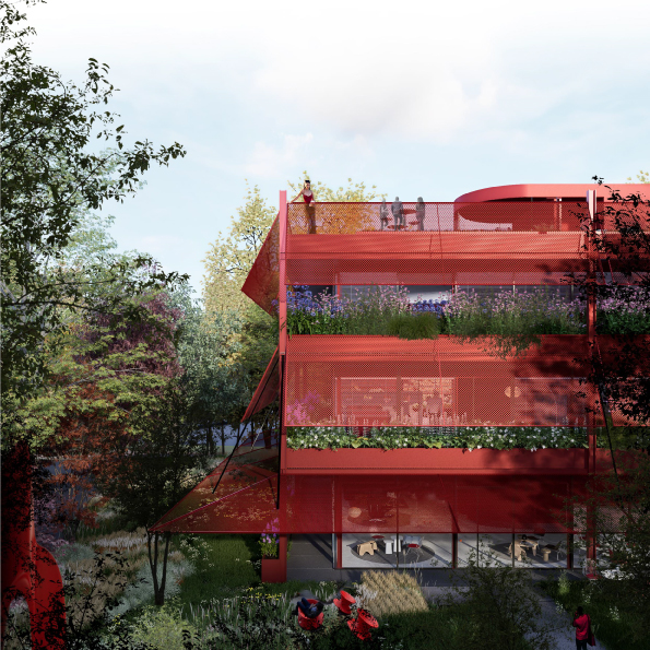 A tárgyszerű megjelenésű épület koncepcióját erősíti az erős színhasználat. Élénk színhatás a komplementerek egymás mellé helyezésével érhető el, ezért választottuk a szomszédos park, a kert, a növényládák és a tető zöldjének kiegészítőjeként a pirosat.